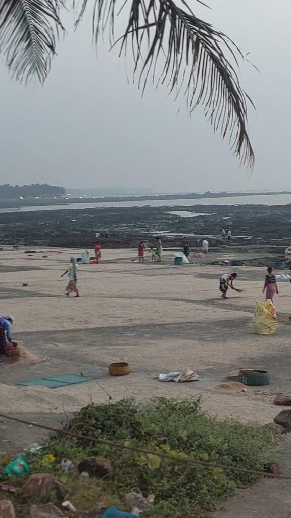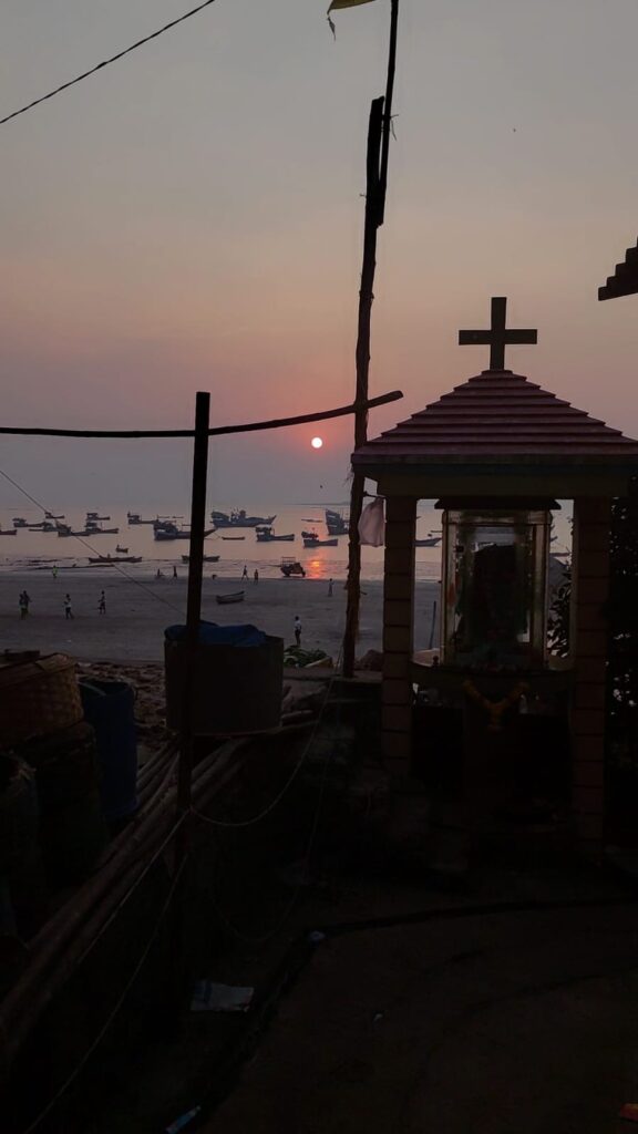 The sun was about to set, so I took a detour and hit the coast. The smell of dried fish hit me first, the signature scent of the western coast. The young were playing cricket on the sand. I stood there watching their silhouettes against the setting sun. The undulating rocks led me to the main landing point where the small boats docked. From there, the church of Velankani was visible. But the most striking was the statue of Mother Mary, towering about 100 feet above the ground.