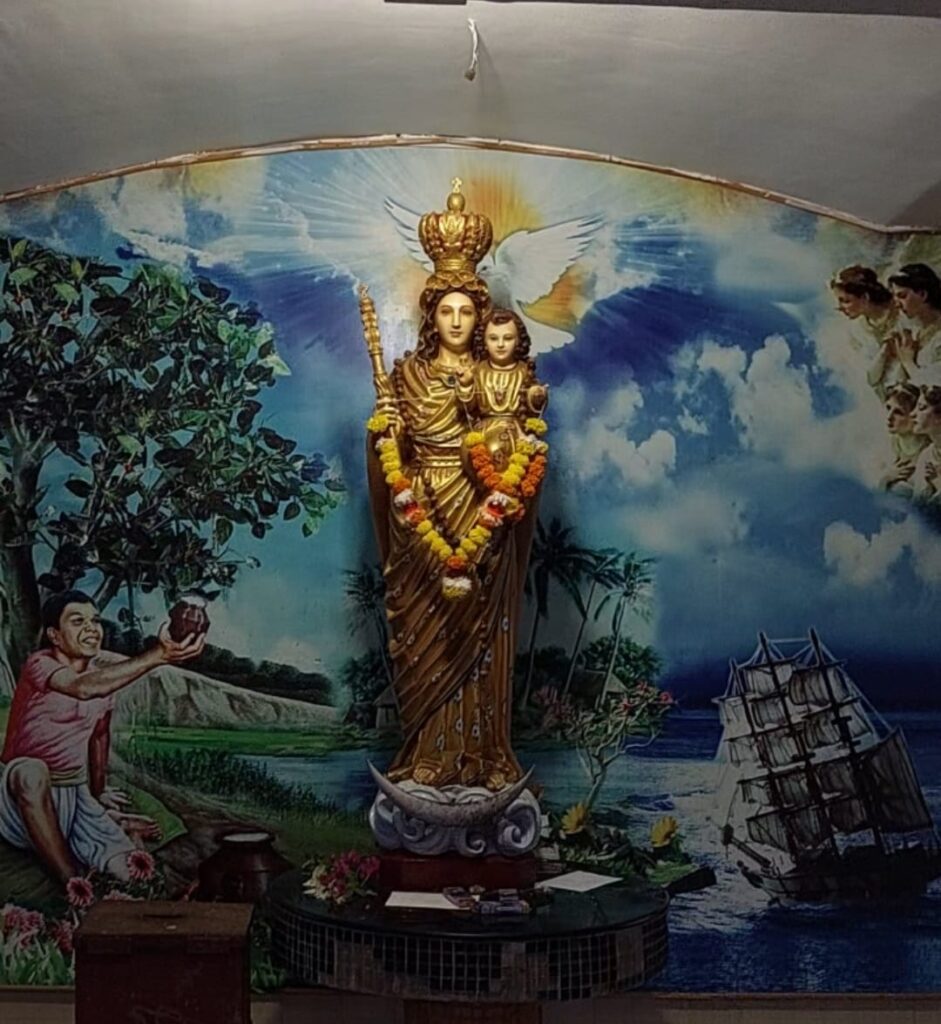 I was almost breathless by the time I climbed up to the statue. The devout and the tourists both, had trekked up the steps. There were construction workers and daily wage labourers just enjoying their time off. Leisure time is precious when you have worked all day. The devout were praying with their hands folded to Mother Mary. The statue depicts Mother Mary as she appeared in Velankani, holding infant Jesus in one hand and a rosary in the other (which was missing). The miracles of Mother Velankani are well known and celebrated in the small town located in Nagapattinam and she is worshiped across India, particularly along the coast. She is known to have appeared in front of a shepherd and asked him for milk for her baby, has cured a differently abled person and rescued a ship full of drowning Portuguese sailors off the coast of Coromandel. That is why she is also known as the Our Lady of Health. This is depicted in a fresco in a small chapel right off the coast at Uttan.