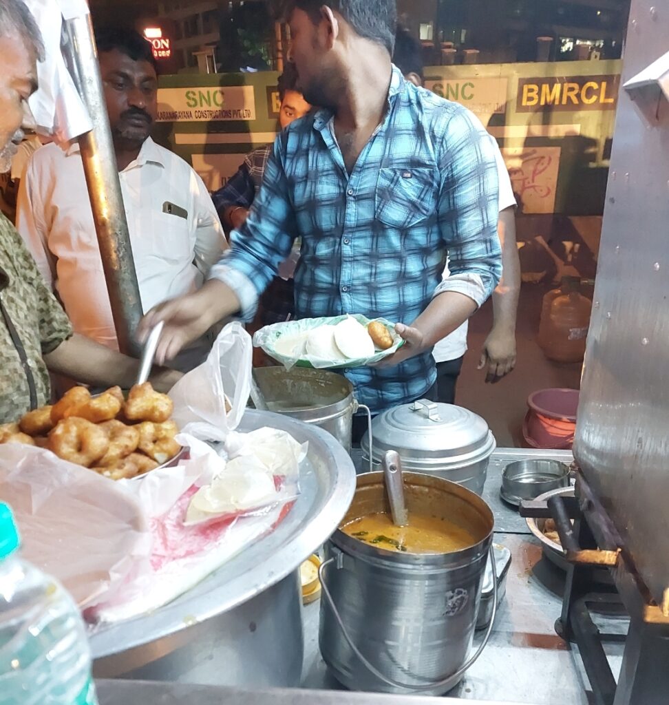 Darshinis: The concept of Darshini is simple. You place an order, collect the coupon, hand it over to a guy behind the counter, serve yourself and then eat your stuff at one of the standing tables and leave your plate wherever. It is the same concept modified and streamlined with an open kitchen and a fancy ordering interface at Rameshwaram. But the underlying idea rests on convenience and affordability. Every nook and corner of Bengaluru has two things – a popular darshini serving hot idlis and fresh dosa to everyone from the working class to the IT consultant and a bakery serving tea and egg puffs. Darshinis would work splendidly in Mumbai. In the evenings carts selling steaming plates of idlis, pulav and crispy vade pop up at busy corners and remain open till wee hours of the morning. These are really good idlis with a spicy chutney – perfect for the late nights in office.