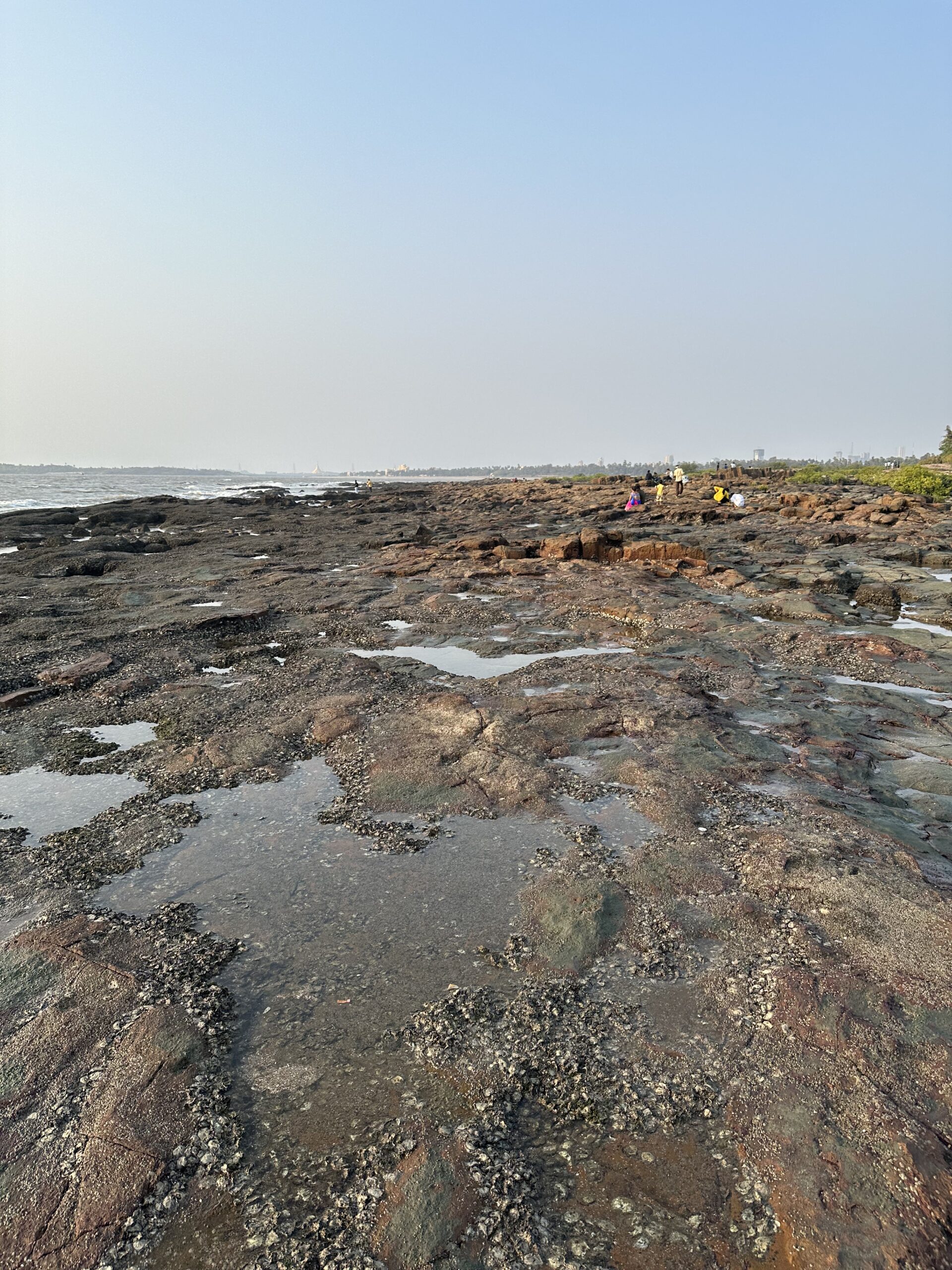 I slowly navigated over the rhyolites – severely eroded by the waves and covered with barnacles and found a spot as close to the waterline as possible. I wanted an unobstructed view of the horizon. To my right was the small island of Manori, which to our younger selves always seemed like Kirrin Island – from the Famous Five Novels. Beyond that shining in the golden hour was the Global Vipassana Pagoda of Gorai and further to the right was the coast of Marve, INS Hamla and of course, the main beach of Aksa.